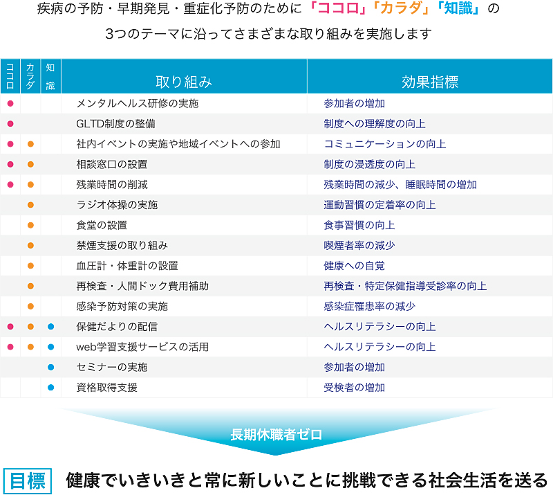 当社は、会社の成長を支える社員と家族の心身の健康を重要な経営資源の一つと捉え、健康維持・増進活動に対する積極的な支援と組織的な健康づくりの推進によって、社員が健康でいきいきと常に新しいことに挑戦できる社会生活と、経済の発展に貢献する会社を目指します。