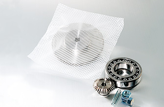 The inside of this film is coated with a volatile corrosion compound. It complies with JIS Z 1535 (anti-tarnish paper standards), and since it generates a rustproofing function by transpiration, its anti-corrosion effect goes to work immediately with iron and iron alloy, something the kneading type can't offer. It can be laminated to protect products and make it more suitable for automatic packaging.