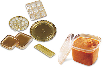 These sheets exhibit a variety of possibilities, including uniquely-expressive printed trays, metallized trays that increase product value with high-quality gloss, and barrier laminated sheets with gas barrier properties without using barrier film. We also offer miso containers with excellent barrier and aroma retaining properties as standard molded products.