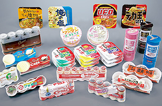 Shrink wrap that fits the shape of various products. Up to eight colors can be printed on it. The wrap can be shrunken to fit various product shapes just as the customer desires. It is used for multi-packaging various products, including yogurt drinks, jellies, and natto, while also used for sealing instant noodles, etc.