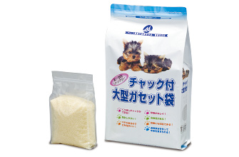 These pouches are easy to open because of a special zipper along the top. Their gusset format provides a large storage capacity with a small amount of packaging material. They can also be filled from the bottom using high-speed, auto-filling technology, making them a useful package for various products, such as cocoa, coffee, and powdered detergents. We offer this product in a large size as well, ideal for holding large quantities of pet food, rice, or industrial products.
