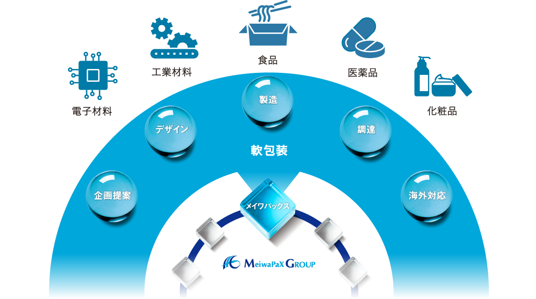 メイワパックスは、包装分野の中でもプラスチックフィルムを素材とする軟包装のプロフェッショナル。お客様の課題解決を目的として製品企画の提案から請け負い、国内の8つの自社工場で質の高い製品を一貫生産し、安定的に供給することが可能です。食品、医薬品、化粧品、電子材料、工業材料など、その用途は多岐にわたり、これまでに手がけてきた製品は10万種にも及びます。近年は接続可能な社会の実現のために、また生活者のニーズの多様化やバリアフリー化などにより、軟包装材に求められる機能も年々高度化・複雑化していますが、私たちは業界の中でも特に未開拓なニッチ分野に着目して果敢に挑戦を続けています。例えば、従来は5層のコーティングで実現されていた機能を2層に改善して資材の削減、工程の短縮とコストダウンを可能にしたり、あるいは電子レンジで調理できるパッケージを開発してお客様の製品の魅力を向上させるなど、私たちにしかできない新しい価値づくりをご提案しています。
